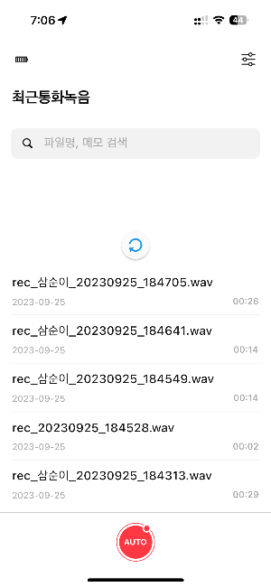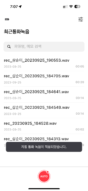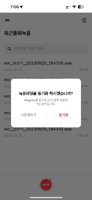 앱을 실행하면 기기와 동기화하여 그사이 저장된 음성파일을 가져올 수 있습니다.