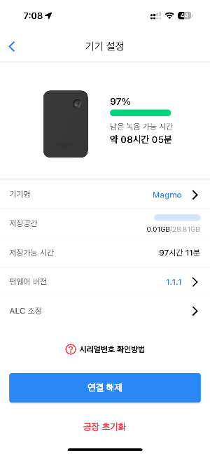 기기 세팅에 보면 남은 녹음가능시간과 배터리를 확인할 수 있습니다.